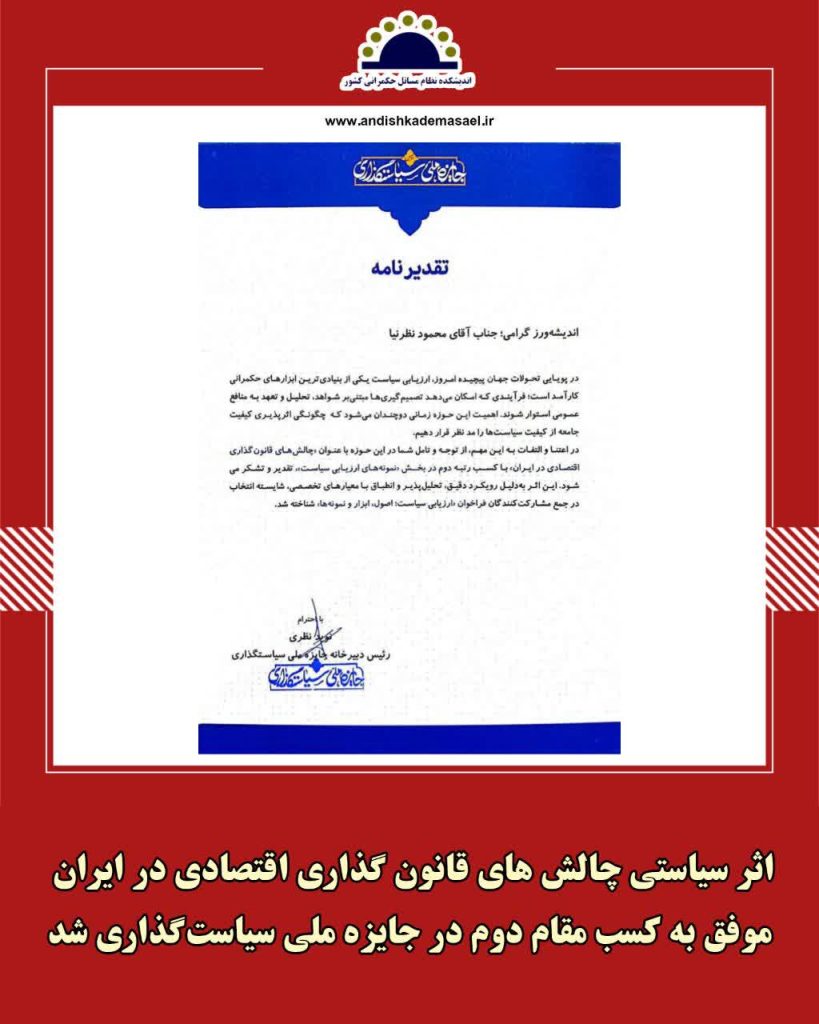 🔸️نتایج بررسی و داوری بیش از ۷۰ اثر درباره ابعاد ارزیابی سیاست، به معرفی و تقدیر ۱۰ اثر منتج شد، که بر همین اساس اثر ” چالش‌های قانون‌گذاری اقتصادی در ایران با نگارش محمود نظرنیا رئیس اندیشکده نظام مسائل حکمرانی کشور به عنوان مقام دوم “ در بخش نمونه ها مورد تجلیل و تقدیر قرار گرفت.