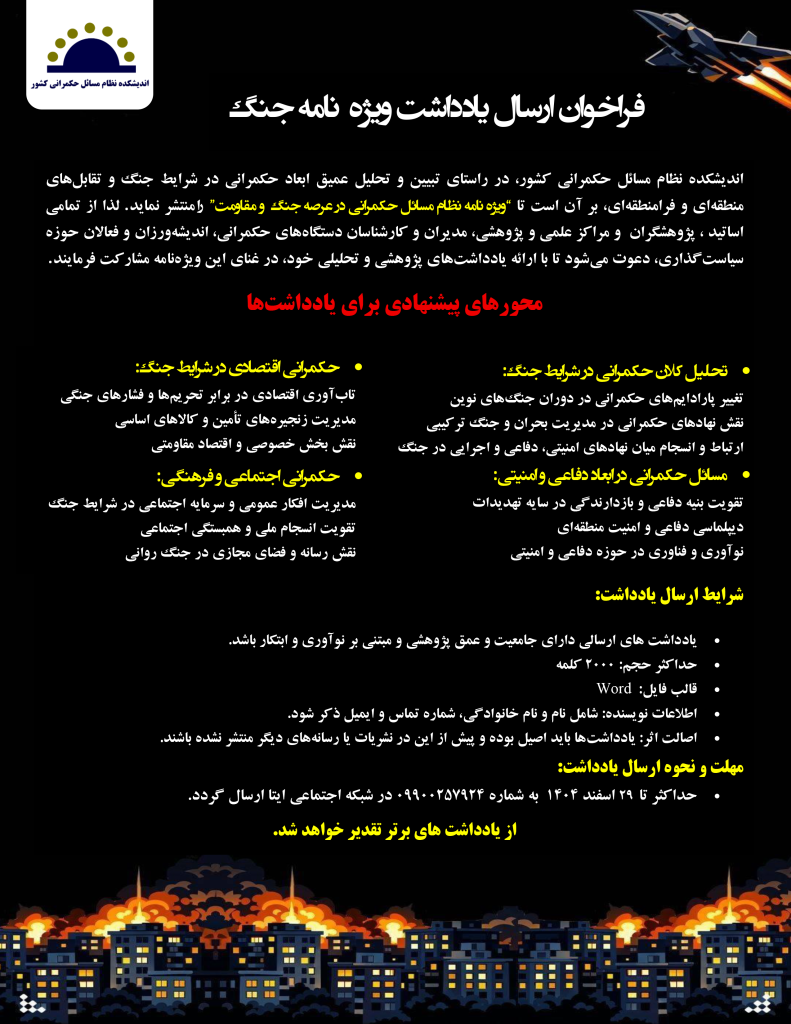 اندیشکده نظام مسائل حکمرانی کشور در راستای تبیین و تحلیل عمیق ابعاد حکمرانی در شرایط جنگ کنونی در نظر دارد “ویژه نامه نظام مسائل حکمرانی در عرصه جنگ و مقاومت” را منتشر نماید.