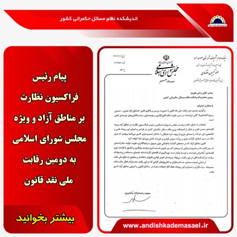 پیام رئیس فراکسیون نظارت بر مناطق آزاد و ویژه اقتصادی مجلس در خصوص رقابت ملی نقد قانون